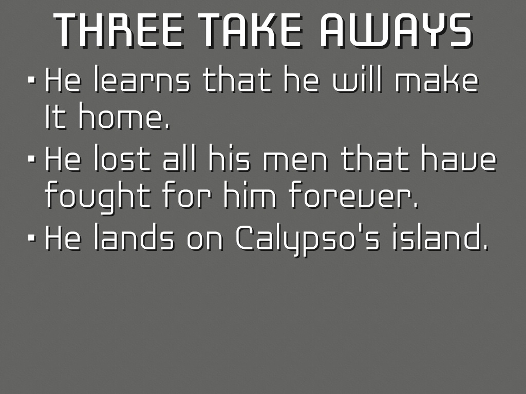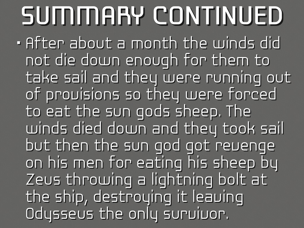 After about a month the winds did not die down enough for them to take sail and they were running out of provisions so they were forced to eat the sun gods sheep. The winds died down and they took sail but then the sun god got revenge on his men for eating his sheep by Zeus throwing a lightning bolt at the ship, destroying it leaving Odysseus the only survivor.