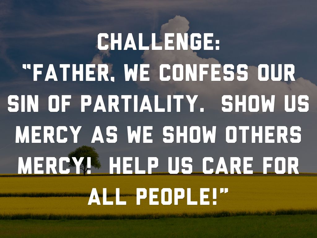 “Father, we confess our sin of partiality. Show us mercy as we show others mercy! Help us CARE for ALL PEOPLE!”