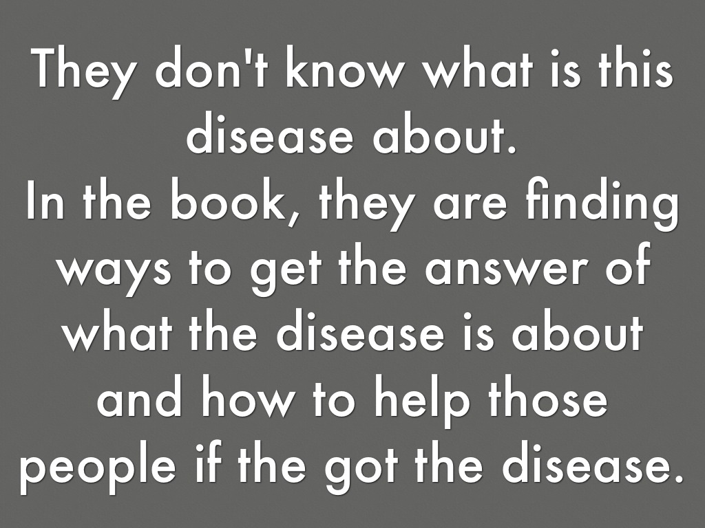 In the book, they are finding ways to get the answer of what the disease is about and how to help those people if the got the disease.