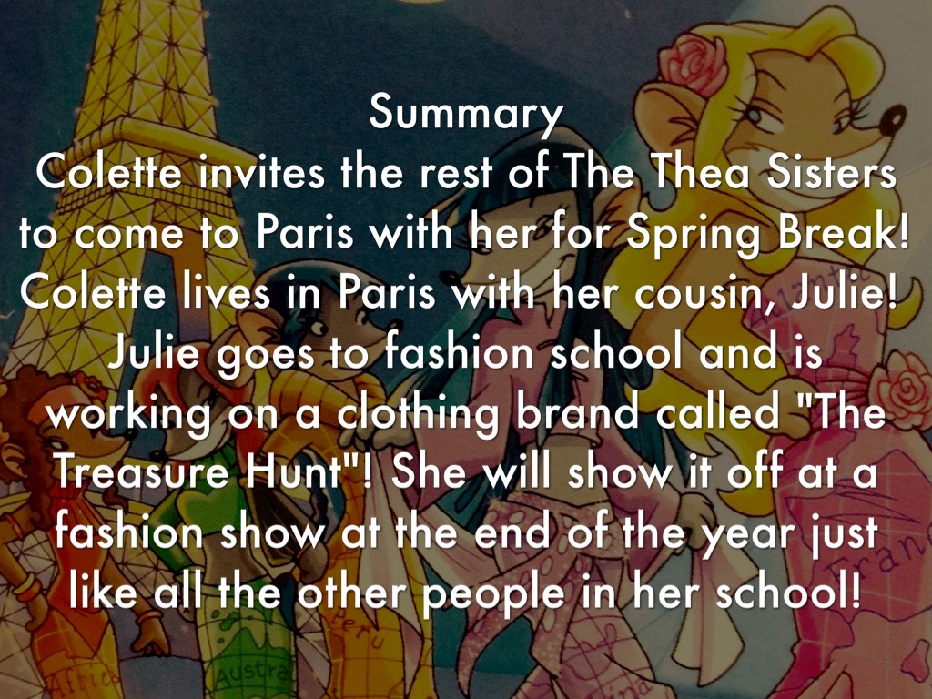 Colette invites the rest of The Thea Sisters to come to Paris with her for Spring Break! Colette lives in Paris with her cousin, Julie! Julie goes to fashion school and is working on a clothing brand called "The Treasure Hunt"! She will show it off at a fashion show at the end of the year just like all the other people in her school!