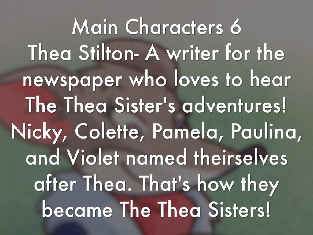 Thea Stilton- A writer for the newspaper who loves to hear The Thea Sister's adventures! Nicky, Colette, Pamela, Paulina, and Violet named theirselves after Thea. That's how they became The Thea Sisters!
