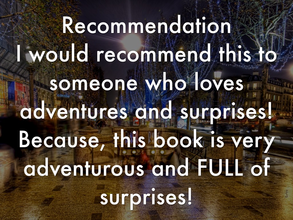 I would recommend this to someone who loves adventures and surprises! Because, this book is very adventurous and FULL of surprises!