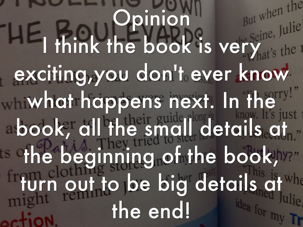 I think the book is very exciting,you don't ever know what happens next. In the book, all the small details at the beginning of the book, turn out to be big details at the end!