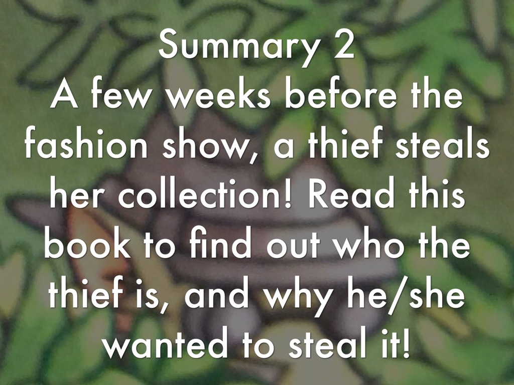 A few weeks before the fashion show, a thief steals her collection! Read this book to find out who the thief is, and why he/she wanted to steal it!