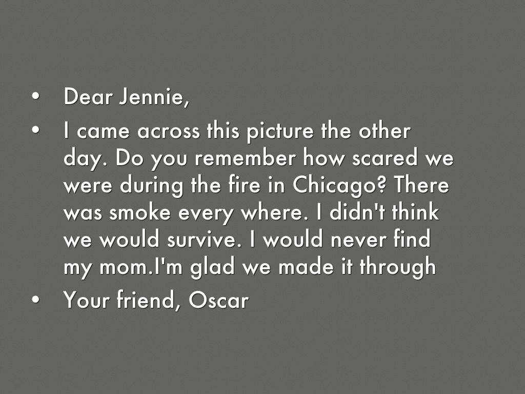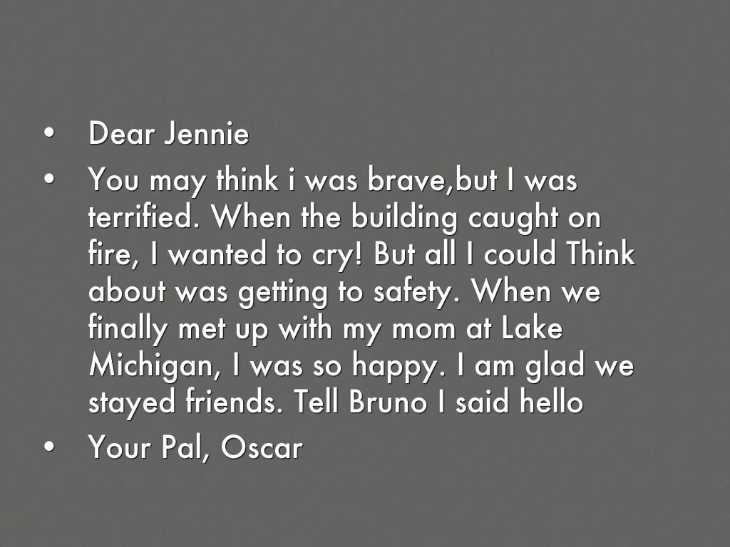 You may think i was brave,but I was terrified. When the building caught on fire, I wanted to cry! But all I could Think about was getting to safety. When we finally met up with my mom at Lake Michigan, I was so happy. I am glad we stayed friends. Tell Bruno I said hello