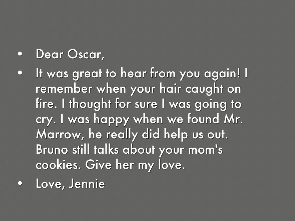 It was great to hear from you again! I remember when your hair caught on fire. I thought for sure I was going to cry. I was happy when we found Mr. Marrow, he really did help us out. Bruno still talks about your mom's cookies. Give her my love.