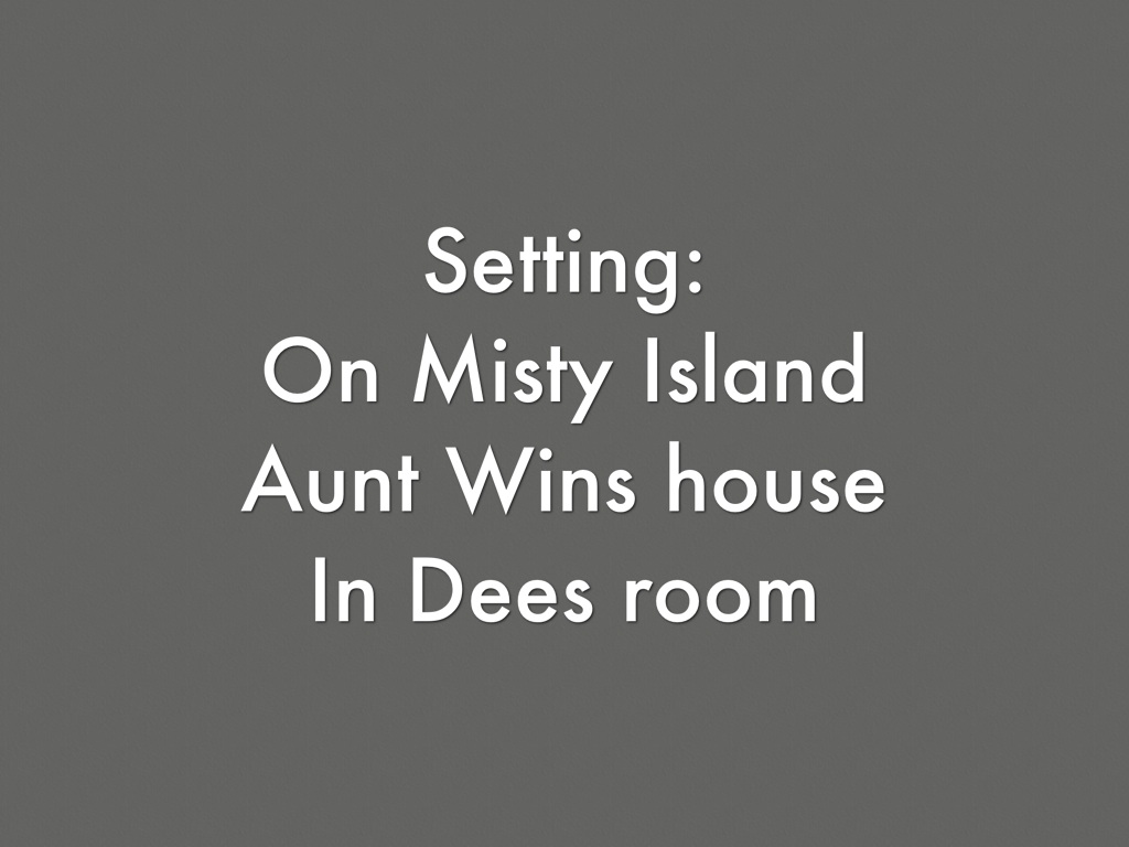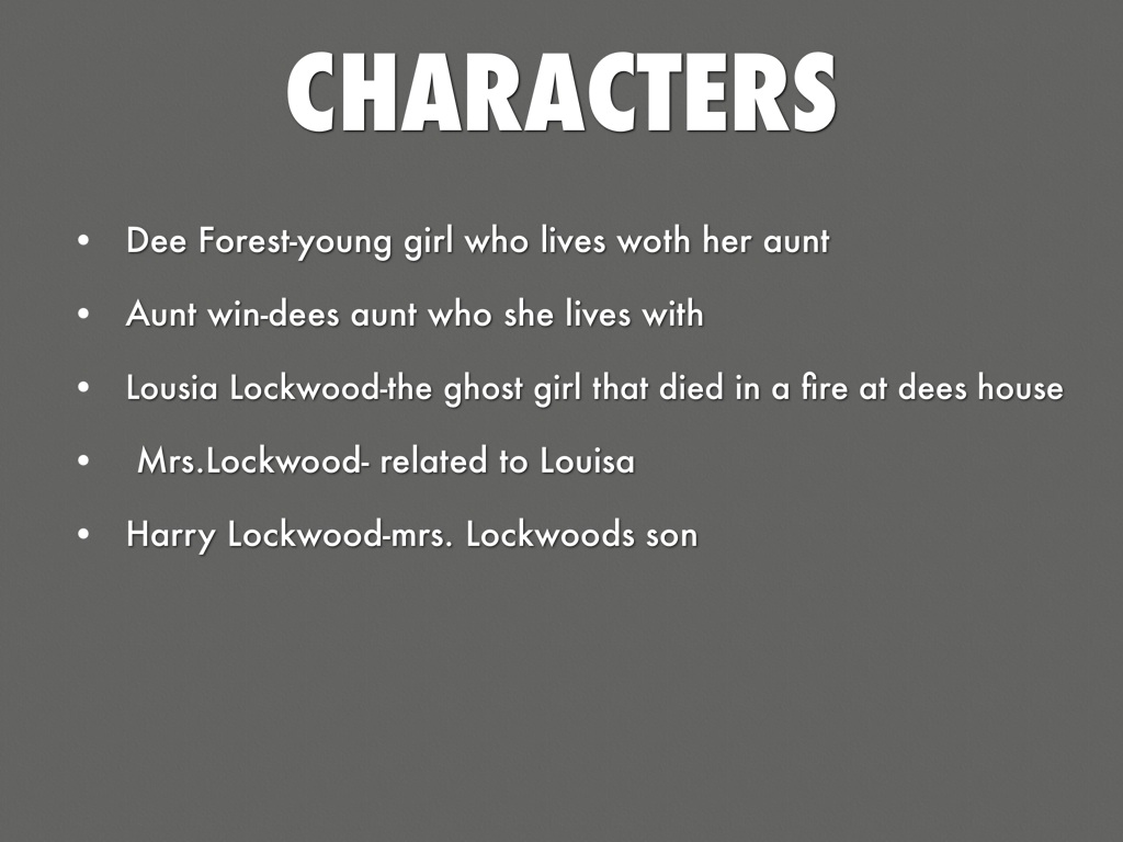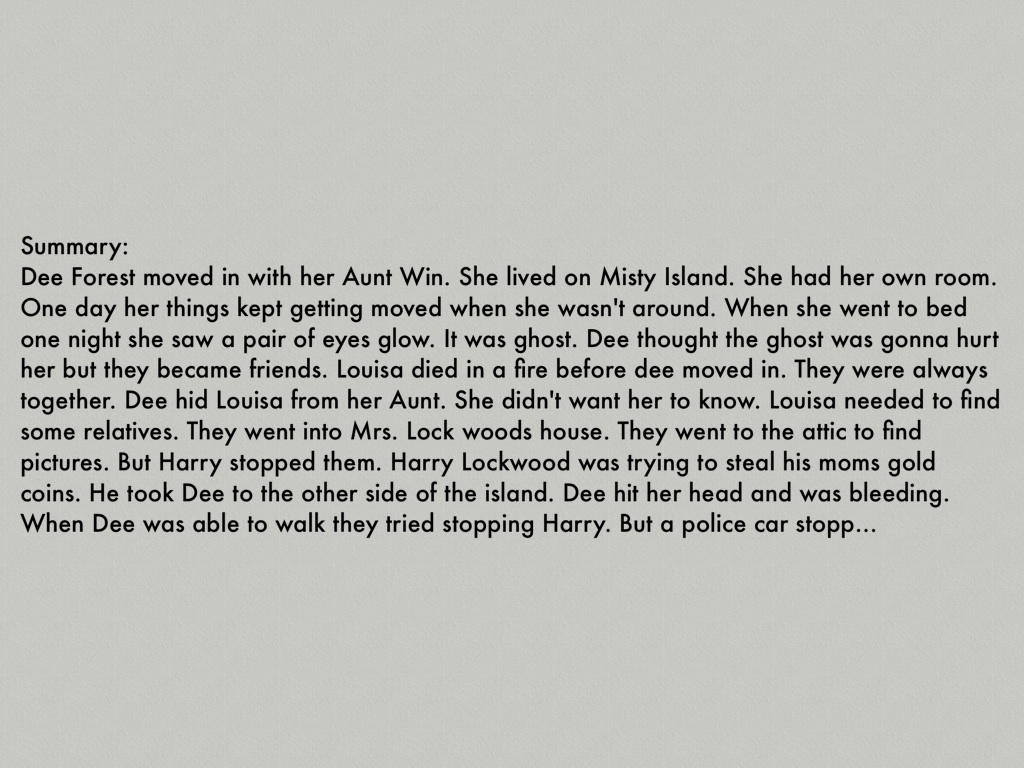 Dee Forest moved in with her Aunt Win. She lived on Misty Island. She had her own room. One day her things kept getting moved when she wasn't around. When she went to bed one night she saw a pair of eyes glow. It was ghost. Dee thought the ghost was gonna hurt her but they became friends. Louisa died in a fire before dee moved in. They were always together. Dee hid Louisa from her Aunt. She didn't want her to know. Louisa needed to find some relatives. They went into Mrs. Lock woods house. They went to the attic to find pictures. But Harry stopped them. Harry Lockwood was trying to steal his moms gold coins. He took Dee to the other side of the island. Dee hit her head and was bleeding. When Dee was able to walk they tried stopping Harry. But a police car stopped them. While Harry was trying to run he dropped the coins. They talked to the police and everything turned put ok. Dee tried to tell her Aunt about Louisa but she didn't believe her.