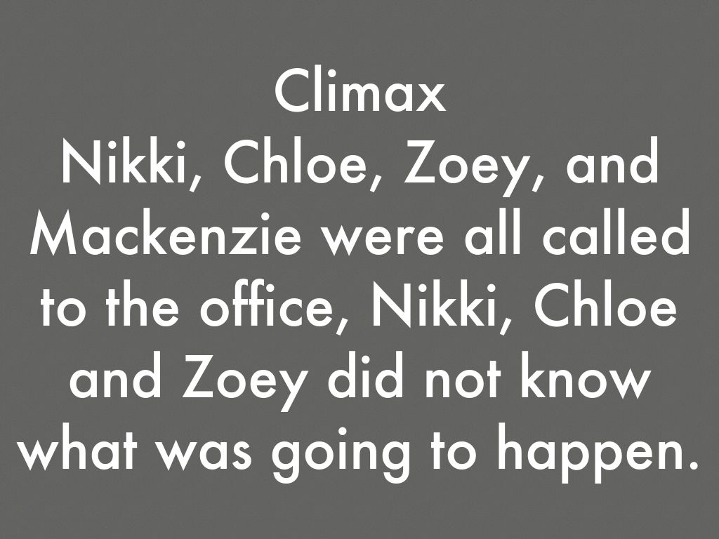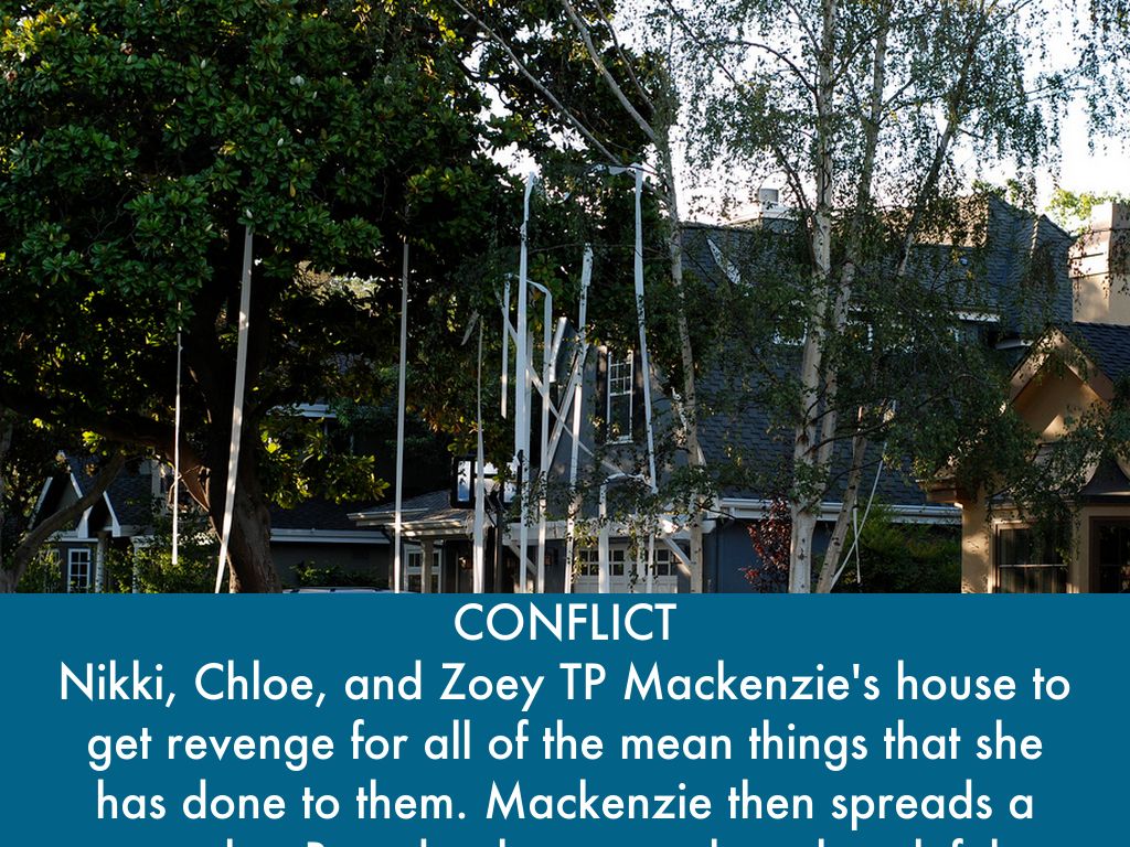 CONFLICT Nikki, Chloe, and Zoey TP Mackenzie's house to get revenge for all of the mean things that she has done to them. Mackenzie then spreads a rumor that Brandon has a crush on her, left her gifts, and TP'd her house to get her attention. Brandon invites Nikki, Chloe, Zoey, and not Mackenzie and Jessica. Mackenzie said that she won't stop spreading the rumor until Nikki gets her and Jessica an invitation to Brandon's birthday party.