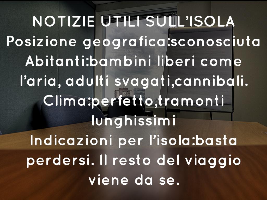 NOTIZIE UTILI SULL’ISOLA Posizione geografica:sconosciuta Abitanti:bambini liberi come l’aria, adulti svagati,cannibali. Clima:perfetto,tramonti lunghissimi Indicazioni per l’isola:basta perdersi. Il resto del viaggio viene da se.