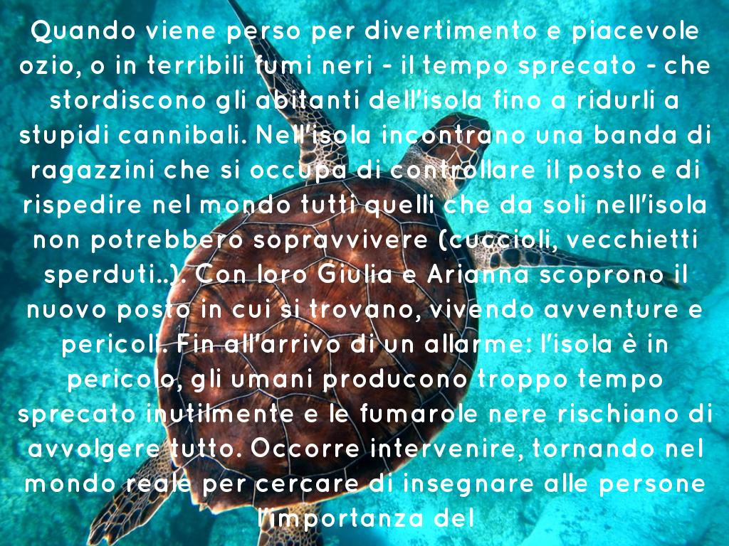 Quando viene perso per divertimento e piacevole ozio, o in terribili fumi neri - il tempo sprecato - che stordiscono gli abitanti dell'isola fino a ridurli a stupidi cannibali. Nell'isola incontrano una banda di ragazzini che si occupa di controllare il posto e di rispedire nel mondo tutti quelli che da soli nell'isola non potrebbero sopravvivere (cuccioli, vecchietti sperduti..). Con loro Giulia e Arianna scoprono il nuovo posto in cui si trovano, vivendo avventure e pericoli. Fin all'arrivo di un allarme: l'isola è in pericolo, gli umani producono troppo tempo sprecato inutilmente e le fumarole nere rischiano di avvolgere tutto. Occorre intervenire, tornando nel mondo reale per cercare di insegnare alle persone l'importanza del