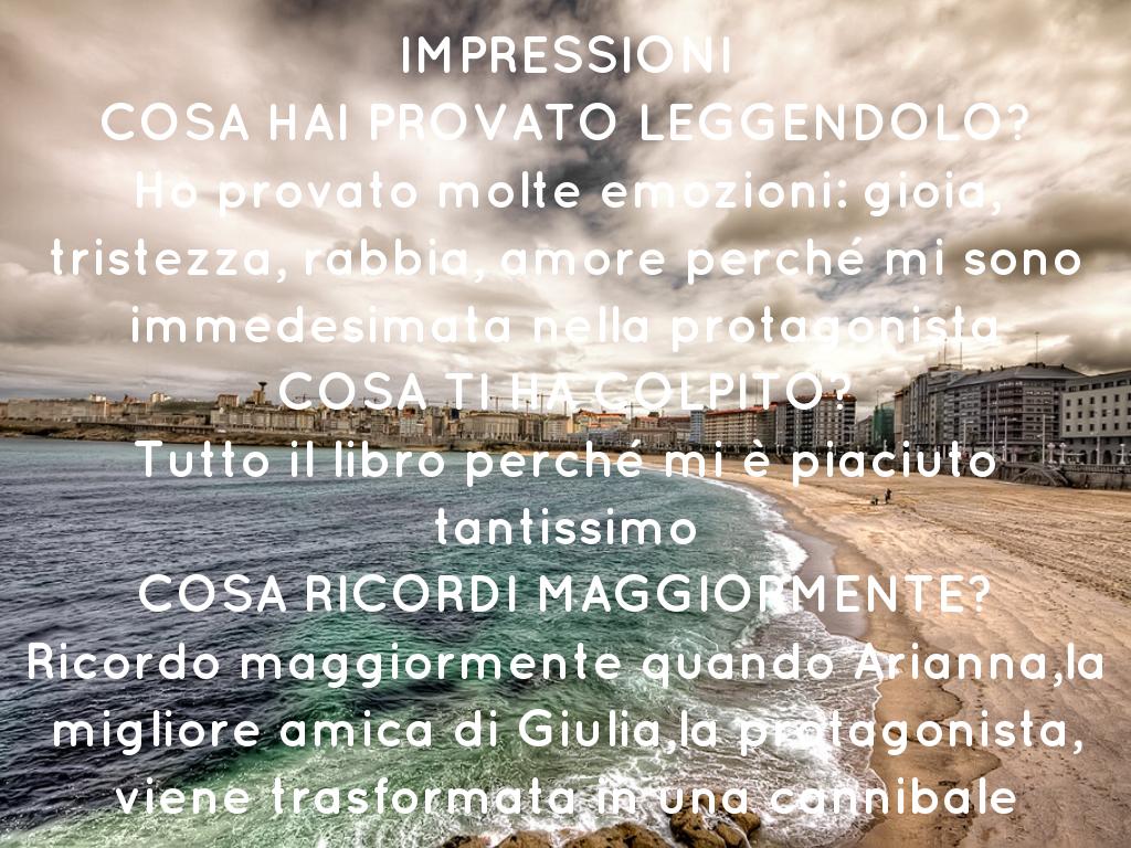 IMPRESSIONI COSA HAI PROVATO LEGGENDOLO? Ho provato molte emozioni: gioia, tristezza, rabbia, amore perché mi sono immedesimata nella protagonista COSA TI HA COLPITO? Tutto il libro perché mi è piaciuto tantissimo COSA RICORDI MAGGIORMENTE? Ricordo maggiormente quando Arianna,la migliore amica di Giulia,la protagonista, viene trasformata in una cannibale