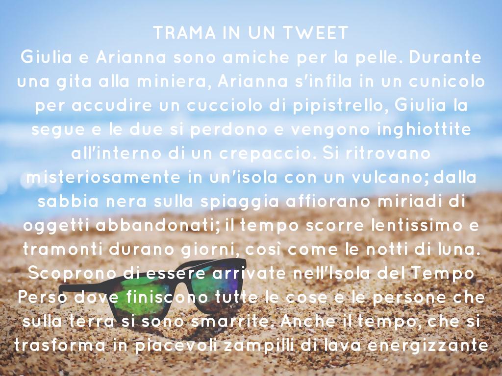 TRAMA IN UN TWEET Giulia e Arianna sono amiche per la pelle. Durante una gita alla miniera, Arianna s'infila in un cunicolo per accudire un cucciolo di pipistrello, Giulia la segue e le due si perdono e vengono inghiottite all'interno di un crepaccio. Si ritrovano misteriosamente in un'isola con un vulcano; dalla sabbia nera sulla spiaggia affiorano miriadi di oggetti abbandonati; il tempo scorre lentissimo e tramonti durano giorni, così come le notti di luna. Scoprono di essere arrivate nell'Isola del Tempo Perso dove finiscono tutte le cose e le persone che sulla terra si sono smarrite. Anche il tempo, che si trasforma in piacevoli zampilli di lava energizzante