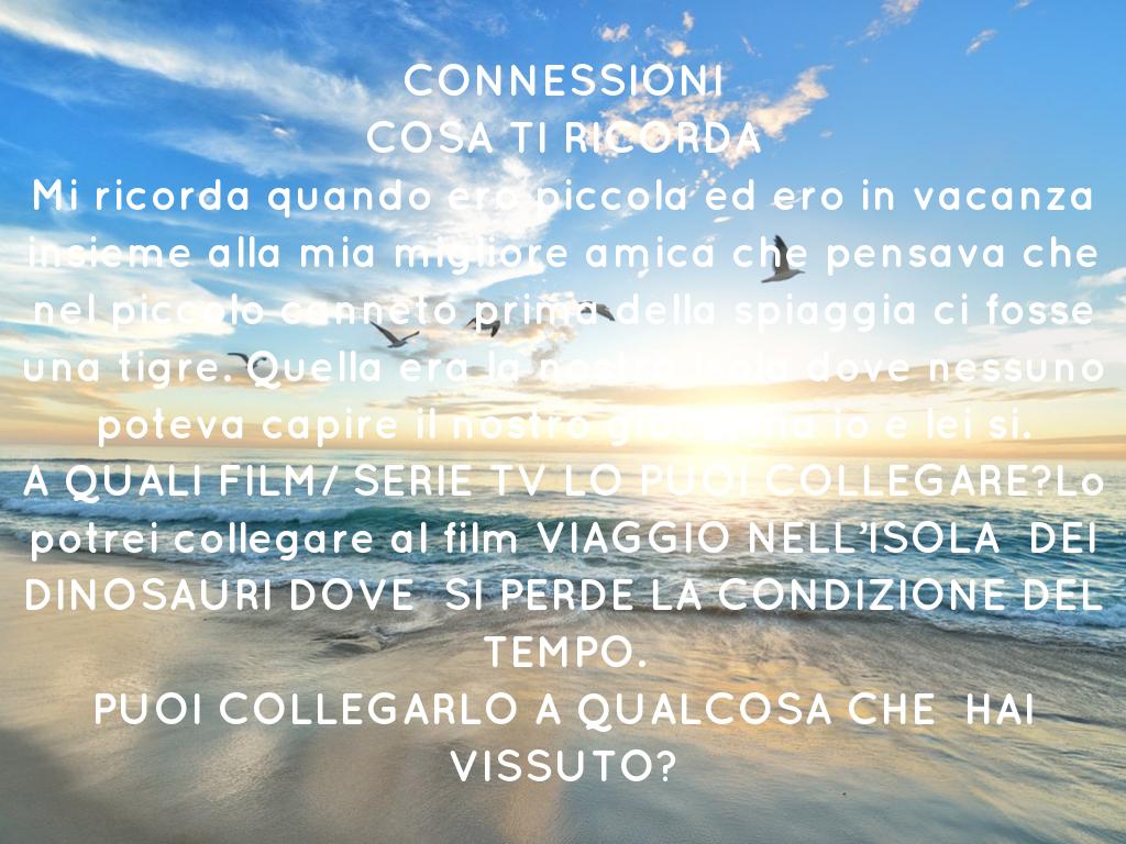 CONNESSIONI COSA TI RICORDA Mi ricorda quando ero piccola ed ero in vacanza insieme alla mia migliore amica che pensava che nel piccolo canneto prima della spiaggia ci fosse una tigre. Quella era la nostra isola dove nessuno poteva capire il nostro gioco, ma io e lei si. A QUALI FILM/ SERIE TV LO PUOI COLLEGARE?Lo potrei collegare al film VIAGGIO NELL’ISOLA DEI DINOSAURI DOVE SI PERDE LA CONDIZIONE DEL TEMPO. PUOI COLLEGARLO A QUALCOSA CHE HAI VISSUTO?