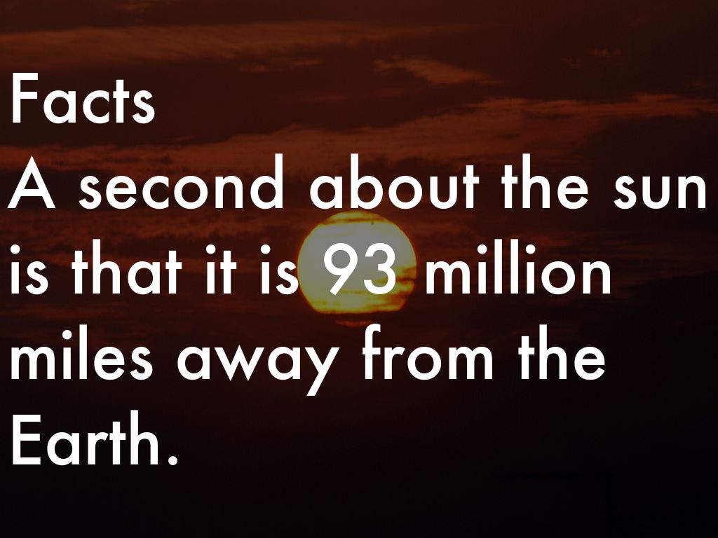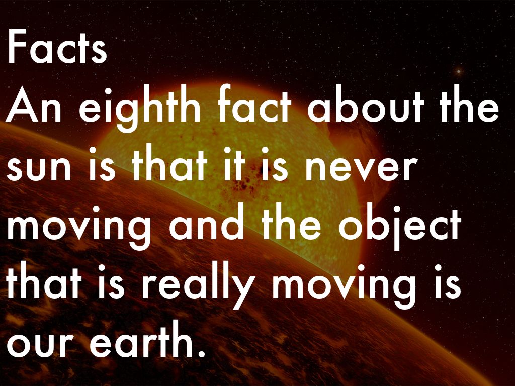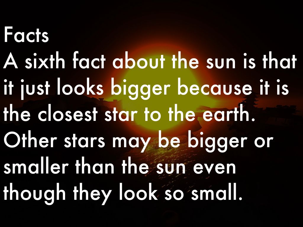 Facts A sixth fact about the sun is that it just looks bigger because it is the closest star to the earth. Other stars may be bigger or smaller than the sun even though they look so small.