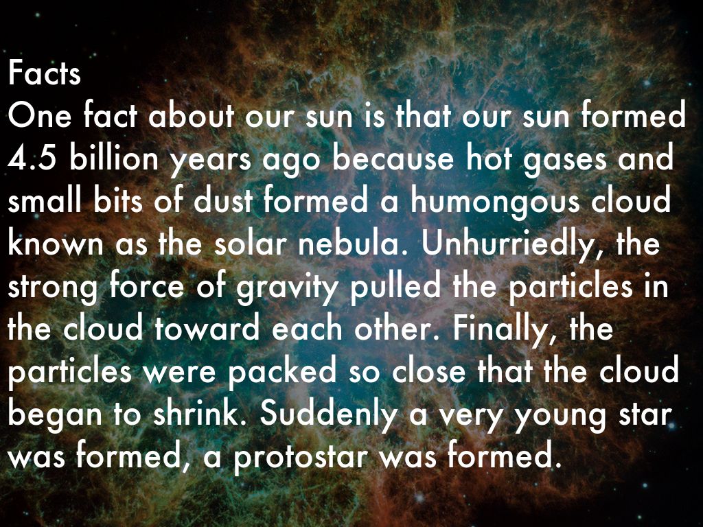 Facts One fact about our sun is that our sun formed 4.5 billion years ago because hot gases and small bits of dust formed a humongous cloud known as the solar nebula. Unhurriedly, the strong force of gravity pulled the particles in the cloud toward each other. Finally, the particles were packed so close that the cloud began to shrink. Suddenly a very young star was formed, a protostar was formed.