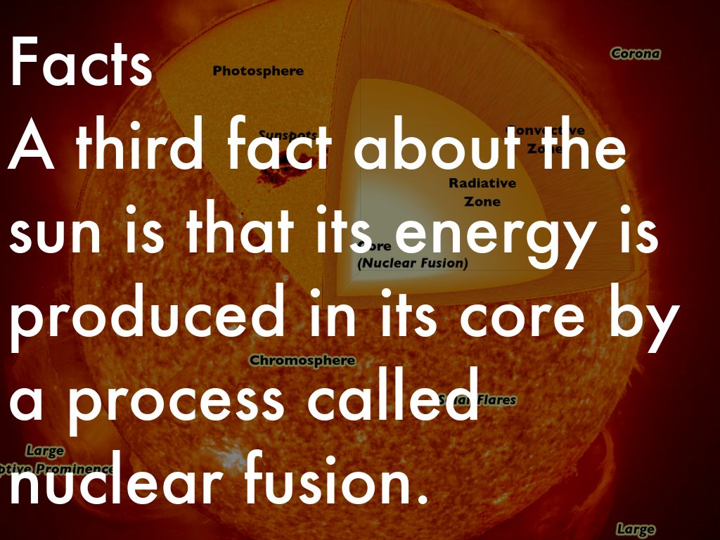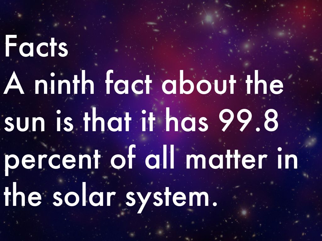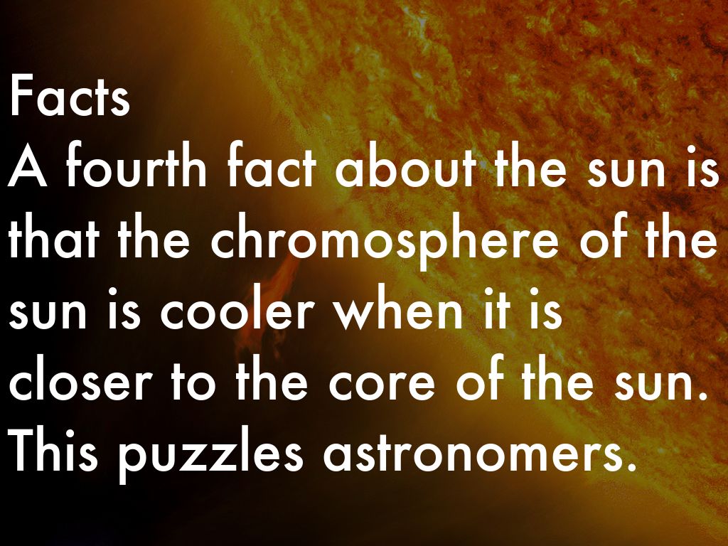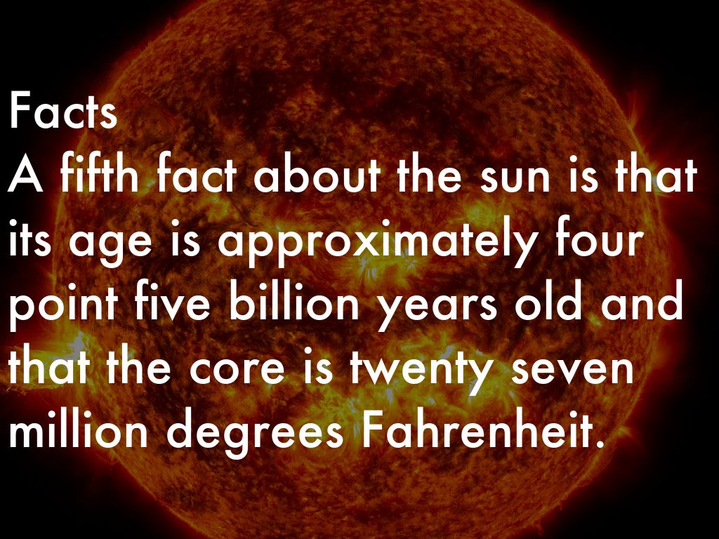 Facts A fifth fact about the sun is that its age is approximately four point five billion years old and that the core is twenty seven million degrees Fahrenheit.