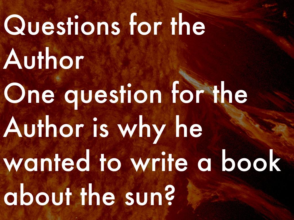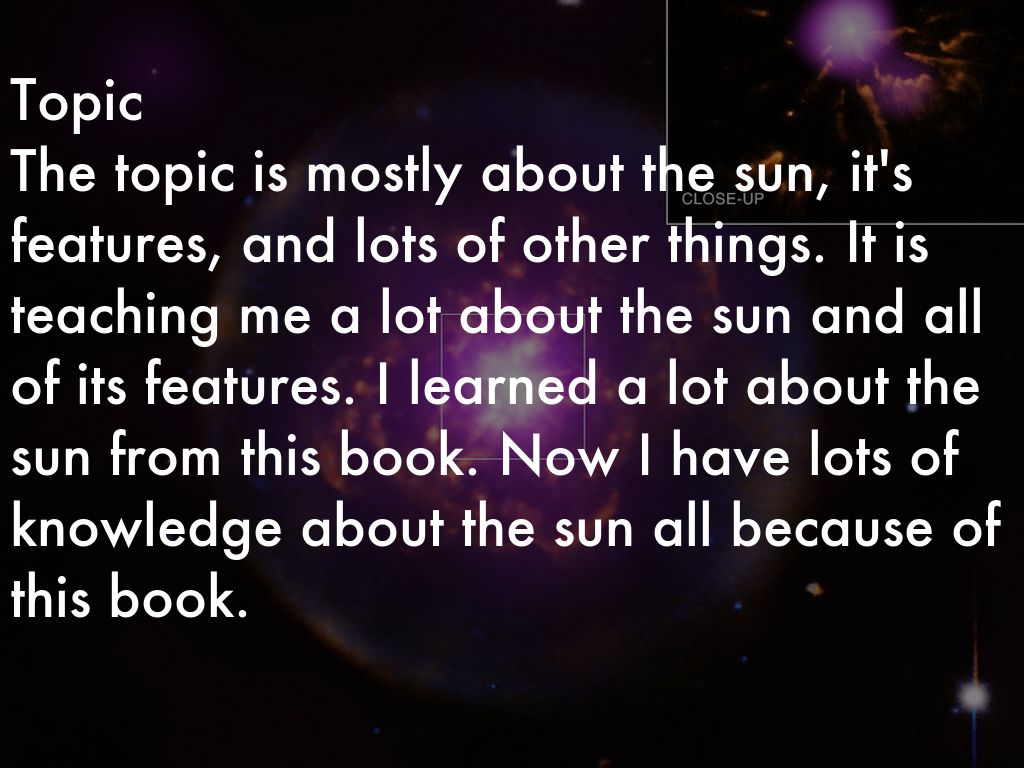 Topic The topic is mostly about the sun, it's features, and lots of other things. It is teaching me a lot about the sun and all of its features. I learned a lot about the sun from this book. Now I have lots of knowledge about the sun all because of this book.