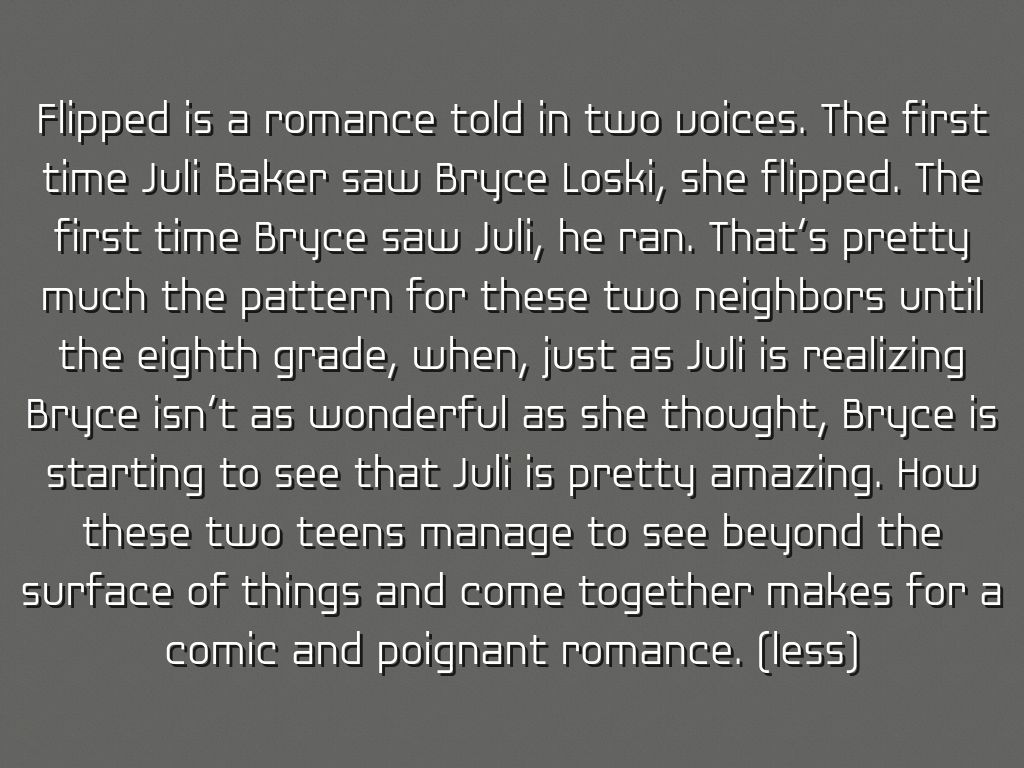 Flipped is a romance told in two voices. The first time Juli Baker saw Bryce Loski, she flipped. The first time Bryce saw Juli, he ran. That’s pretty much the pattern for these two neighbors until the eighth grade, when, just as Juli is realizing Bryce isn’t as wonderful as she thought, Bryce is starting to see that Juli is pretty amazing. How these two teens manage to see beyond the surface of things and come together makes for a comic and poignant romance. (less)