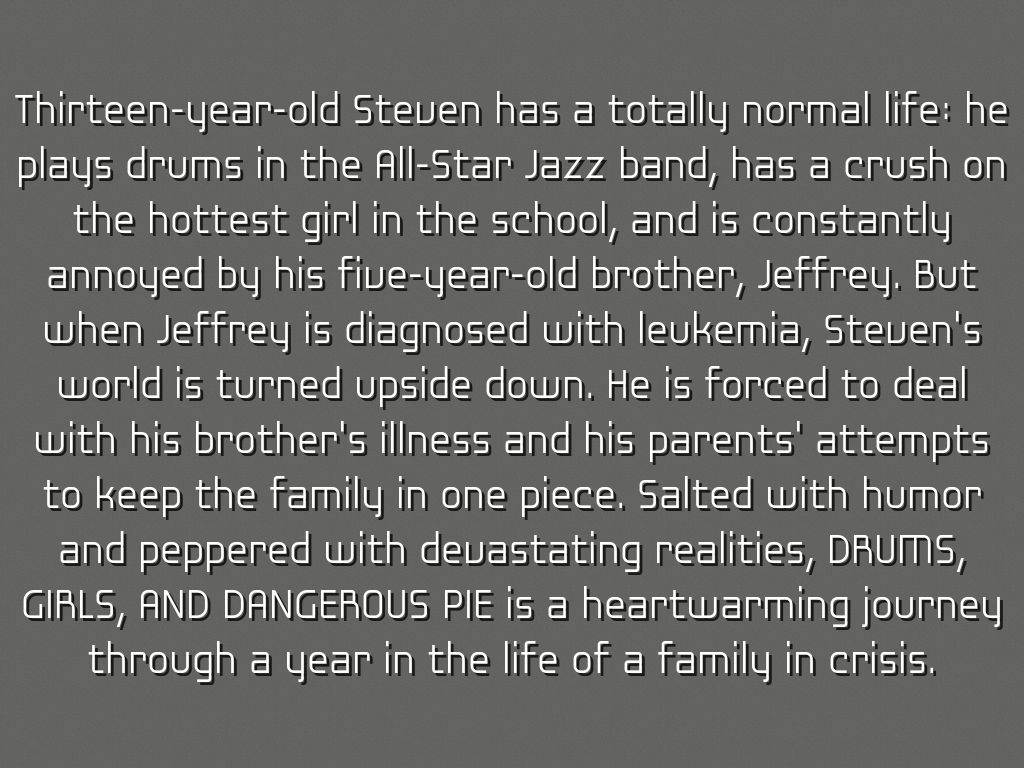 Thirteen-year-old Steven has a totally normal life: he plays drums in the All-Star Jazz band, has a crush on the hottest girl in the school, and is constantly annoyed by his five-year-old brother, Jeffrey. But when Jeffrey is diagnosed with leukemia, Steven's world is turned upside down. He is forced to deal with his brother's illness and his parents' attempts to keep the family in one piece. Salted with humor and peppered with devastating realities, DRUMS, GIRLS, AND DANGEROUS PIE is a heartwarming journey through a year in the life of a family in crisis.