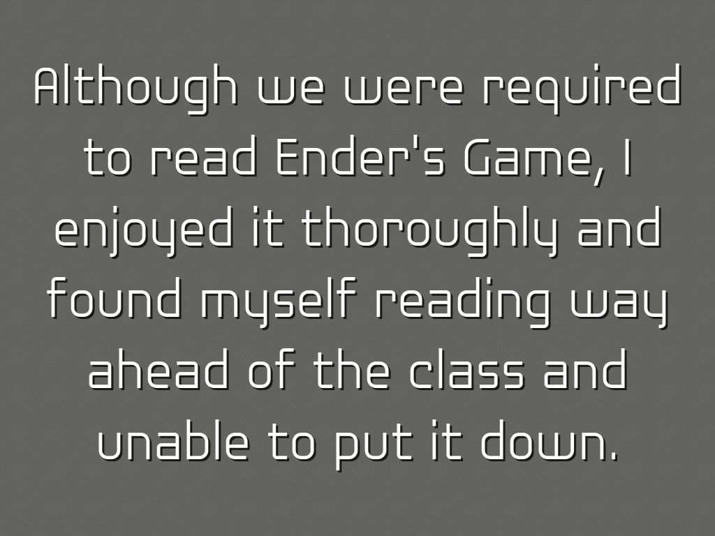 Although we were required to read Ender's Game, I enjoyed it thoroughly and found myself reading way ahead of the class and unable to put it down.