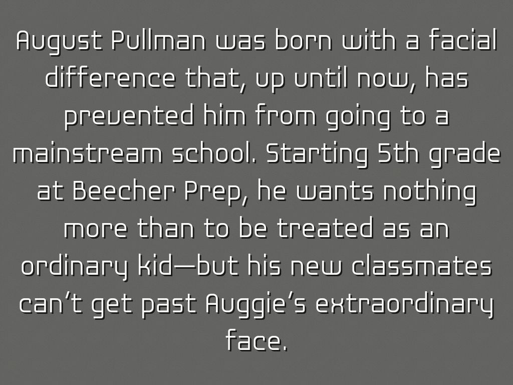 August Pullman was born with a facial difference that, up until now, has prevented him from going to a mainstream school. Starting 5th grade at Beecher Prep, he wants nothing more than to be treated as an ordinary kid—but his new classmates can’t get past Auggie’s extraordinary face.