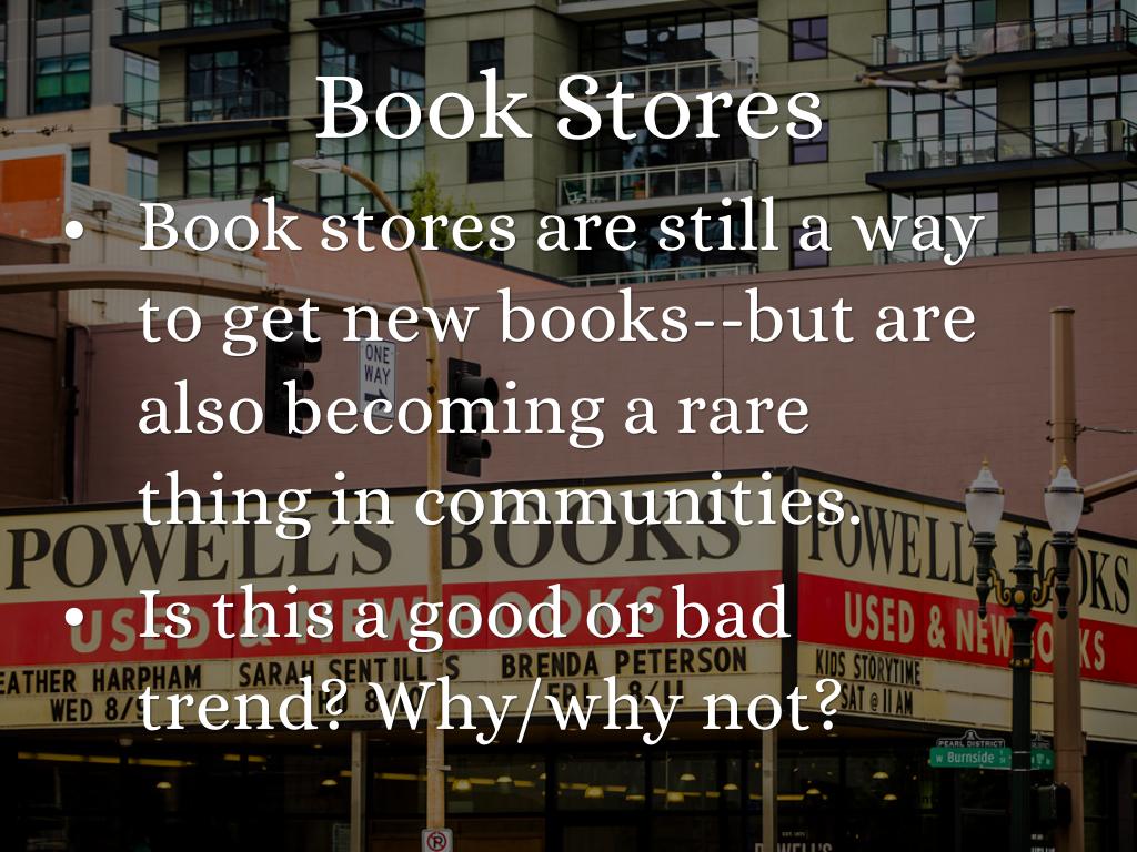 Book stores are still a way to get new books--but are also becoming a rare thing in communities.