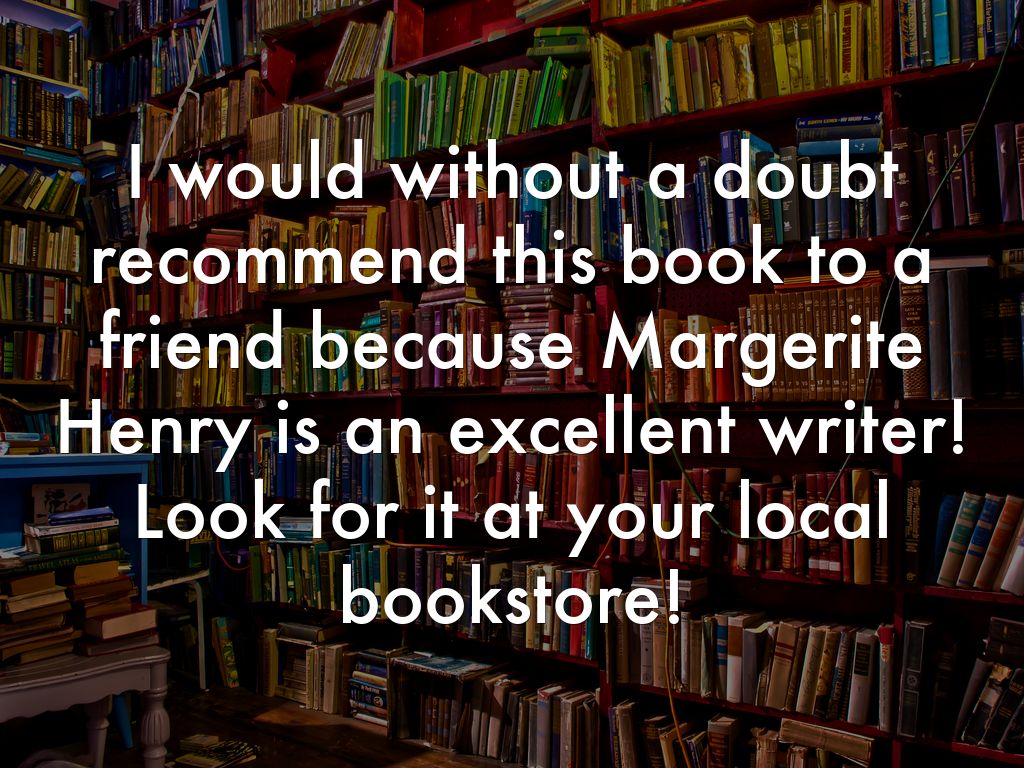 I would without a doubt recommend this book to a friend because Margerite Henry is an excellent writer! Look for it at your local bookstore!