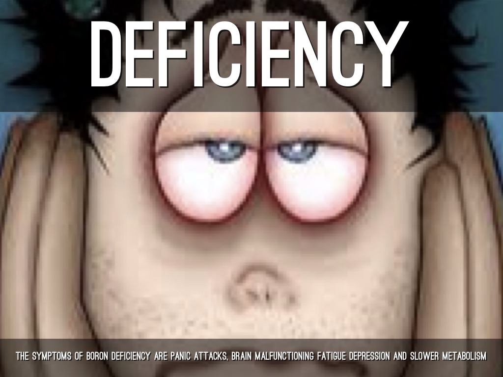 THE SYMPTOMS OF BORON DEFICIENCY ARE PANIC ATTACKS, BRAIN MALFUNCTIONING FATIGUE DEPRESSION AND SLOWER METABOLISM