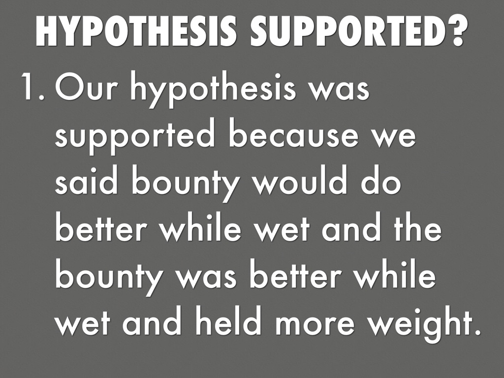 Our hypothesis was supported because we said bounty would do better while wet and the bounty was better while wet and held more weight.