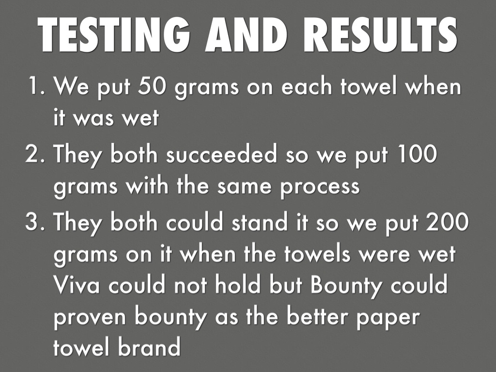They both could stand it so we put 200 grams on it when the towels were wet Viva could not hold but Bounty could proven bounty as the better paper towel brand