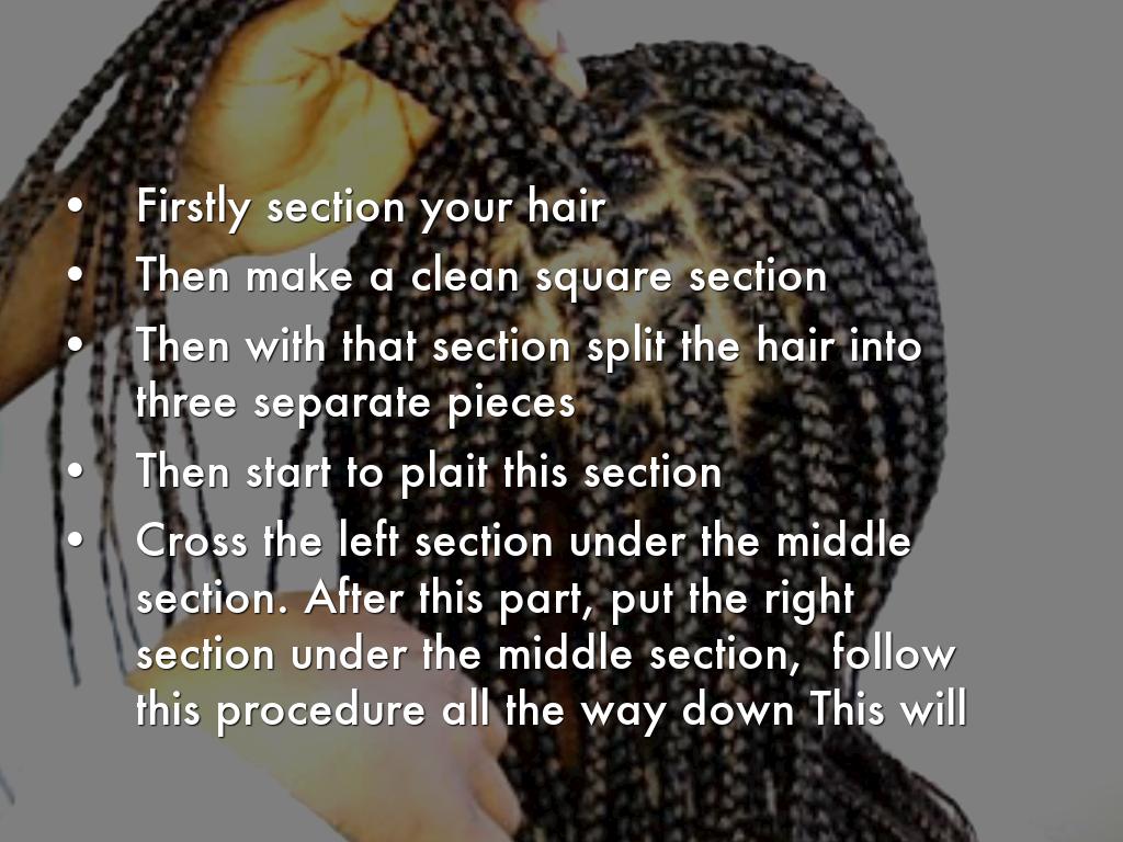 Cross the left section under the middle section. After this part, put the right section under the middle section, follow this procedure all the way down This will result in a braid.