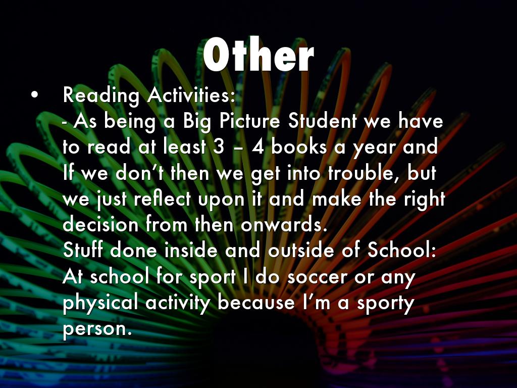 - As being a Big Picture Student we have to read at least 3 – 4 books a year and If we don’t then we get into trouble, but we just reflect upon it and make the right decision from then onwards.
