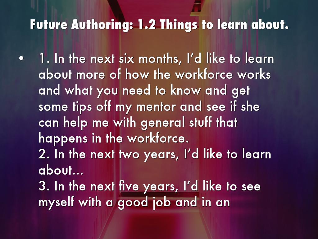 1. In the next six months, I’d like to learn about more of how the workforce works and what you need to know and get some tips off my mentor and see if she can help me with general stuff that happens in the workforce.