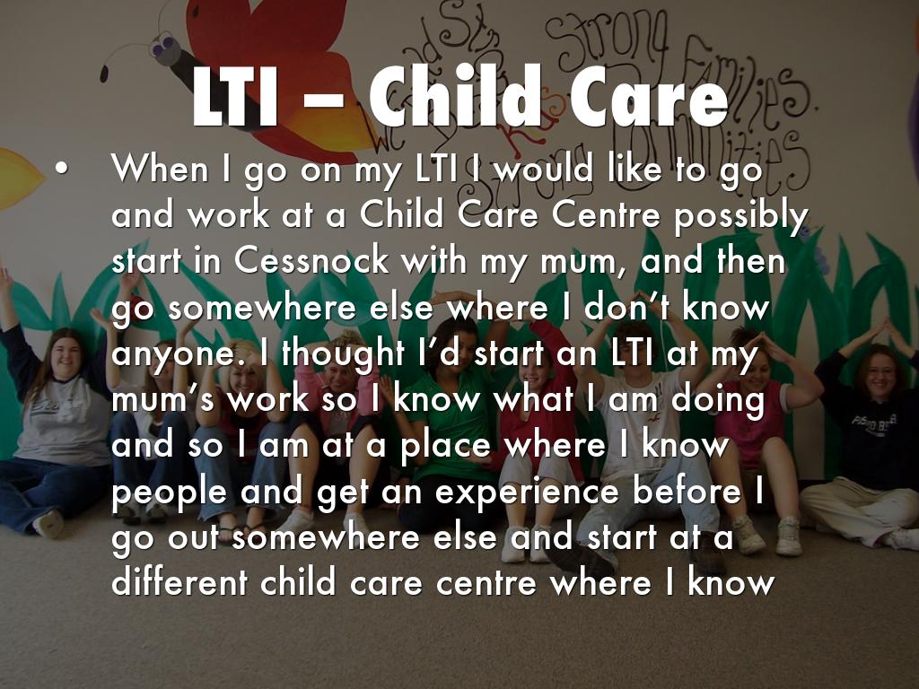 When I go on my LTI I would like to go and work at a Child Care Centre possibly start in Cessnock with my mum, and then go somewhere else where I don’t know anyone. I thought I’d start an LTI at my mum’s work so I know what I am doing and so I am at a place where I know people and get an experience before I go out somewhere else and start at a different child care centre where I know no-one.