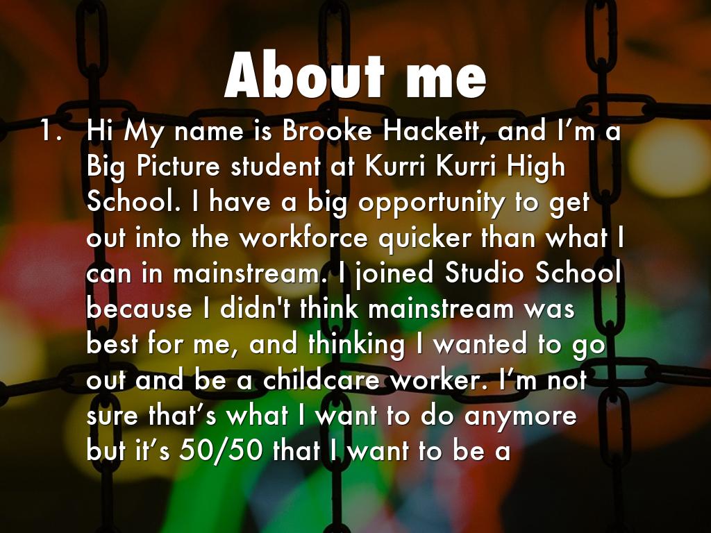 Hi My name is Brooke Hackett, and I’m a Big Picture student at Kurri Kurri High School. I have a big opportunity to get out into the workforce quicker than what I can in mainstream. I joined Studio School because I didn't think mainstream was best for me, and thinking I wanted to go out and be a childcare worker. I’m not sure that’s what I want to do anymore but it’s 50/50 that I want to be a childcare worker and the other 50 that I don’t want to be, I'm looking at doing childcare for a starter job and for an LTI but you never know due to it may turn into a full time job.