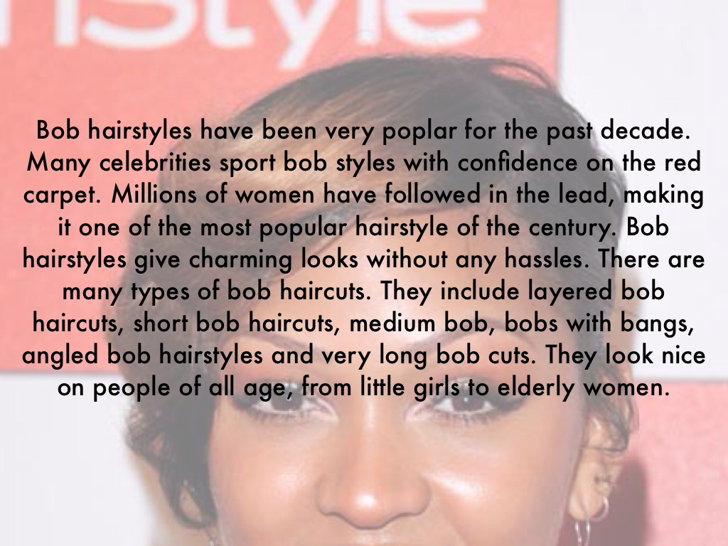 A bob is a short haircut that became modern for women in the early 1920s. It is a trendy style which will never go out of hair fashion. Many celebrities have chosen bob hairstyles to highlight their beautiful features. Bob hairstyles are modern and trendy, with enough variations available to be the perfect hairstyle for anyone.