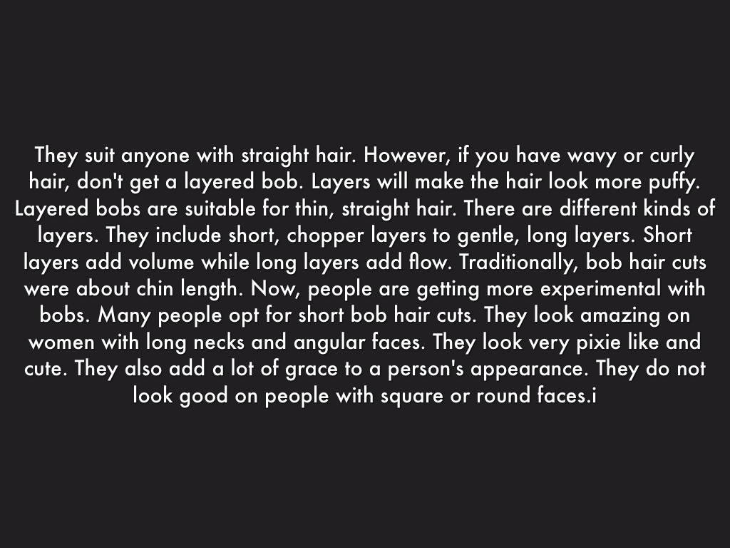 They suit anyone with straight hair. However, if you have wavy or curly hair, don't get a layered bob. Layers will make the hair look more puffy. Layered bobs are suitable for thin, straight hair. There are different kinds of layers. They include short, chopper layers to gentle, long layers. Short layers add volume while long layers add flow. Traditionally, bob hair cuts were about chin length. Now, people are getting more experimental with bobs. Many people opt for short bob hair cuts. They look amazing on women with long necks and angular faces. They look very pixie like and cute. They also add a lot of grace to a person's appearance. They do not look good on people with square or round faces.i