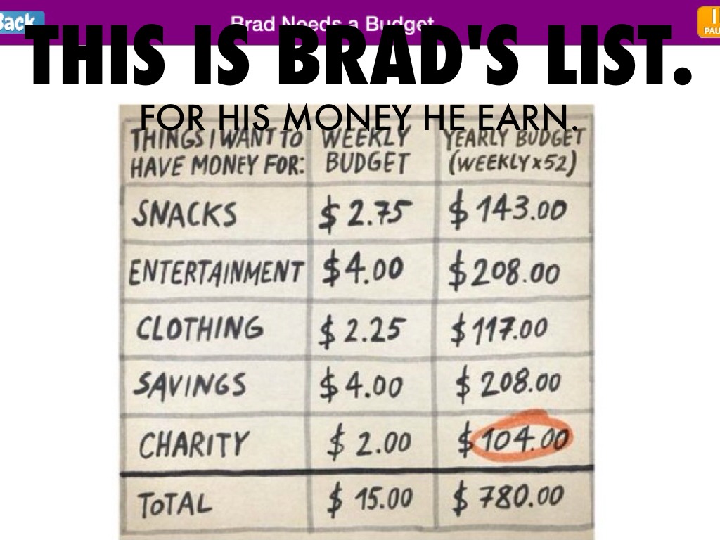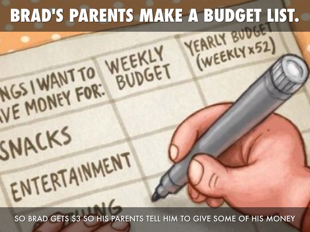 BRAD'S PARENTS MAKE A BUDGET LIST.