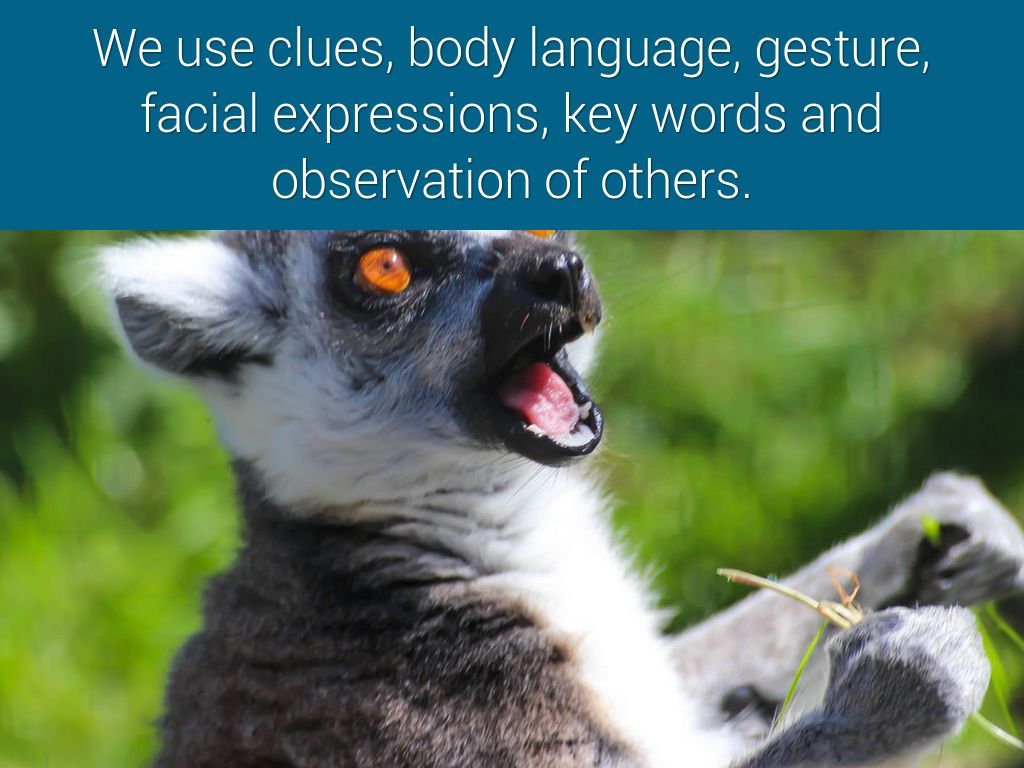 We use clues, body language, gesture, facial expressions, key words and observation of others.