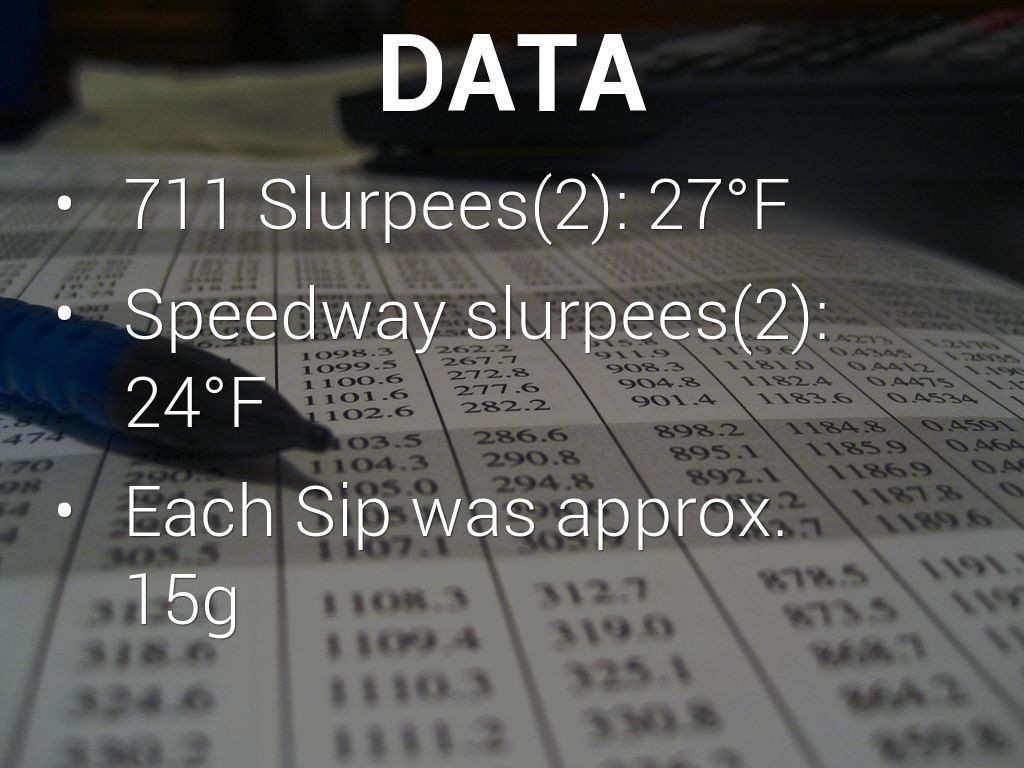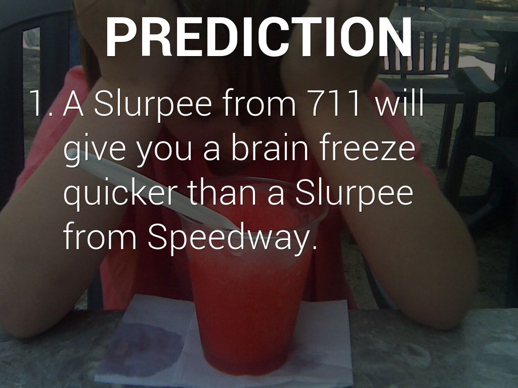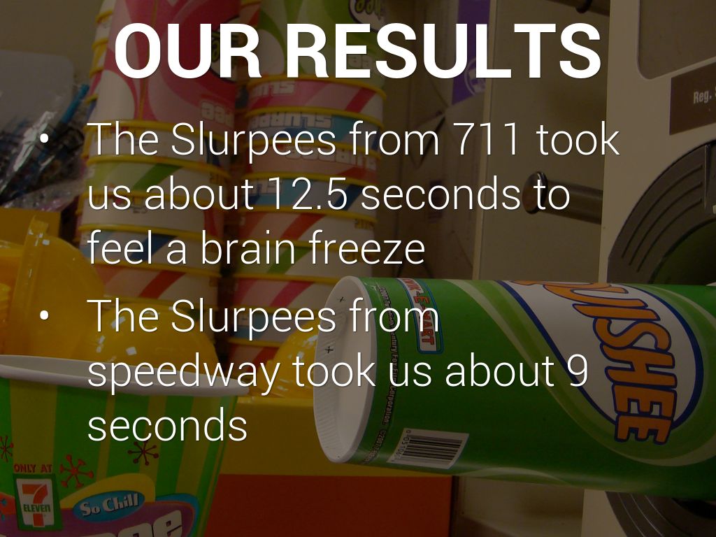 • How fast can you get a brain freeze from a Slurpee from 711 and speedway? From the data we collected, a Slurpee from Speedway gave us a brain freeze quicker than one from 711.
