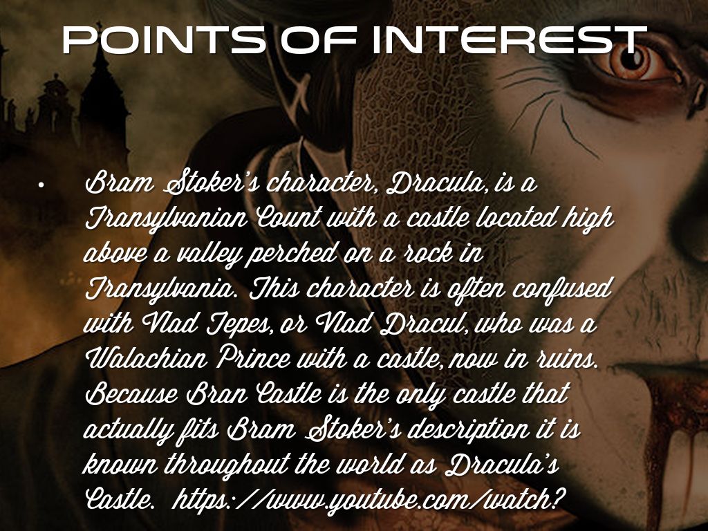 Bram Stoker’s character, Dracula, is a Transylvanian Count with a castle located high above a valley perched on a rock in Transylvania. This character is often confused with Vlad Tepes, or Vlad Dracul, who was a Walachian Prince with a castle, now in ruins. Because Bran Castle is the only castle that actually fits Bram Stoker’s description it is known throughout the world as Dracula’s Castle. https://www.youtube.com/watch?v=V7eJn1id4WA