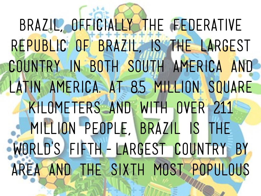 Brazil, officially the Federative Republic of Brazil, is the largest country in both South America and Latin America. At 8.5 million square kilometers and with over 211 million people, Brazil is the world's fifth-largest country by area and the sixth most populous