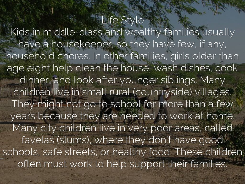Kids in middle-class and wealthy families usually have a housekeeper, so they have few, if any, household chores. In other families, girls older than age eight help clean the house, wash dishes, cook dinner, and look after younger siblings. Many children live in small rural (countryside) villages. They might not go to school for more than a few years because they are needed to work at home. Many city children live in very poor areas, called favelas (slums), where they don’t have good schools, safe streets, or healthy food. These children often must work to help support their families.