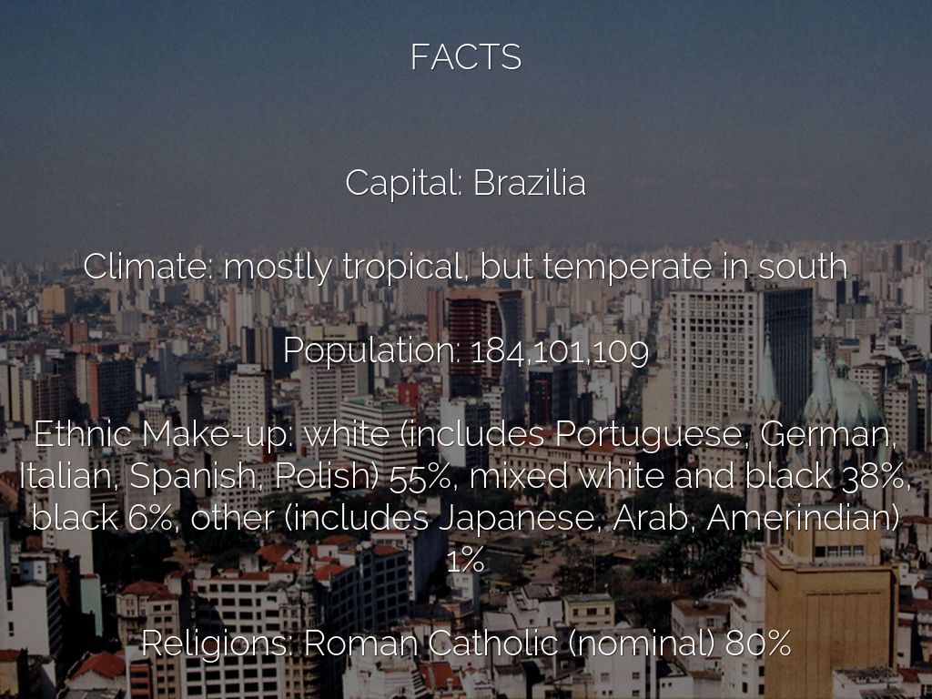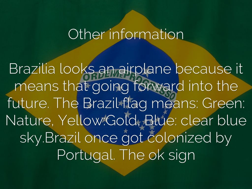 Brazilia looks an airplane because it means that going forward into the future. The Brazil flag means: Green: Nature, Yellow:Gold, Blue: clear blue sky.Brazil once got colonized by Portugal. The OK sign is rude in Brazil.