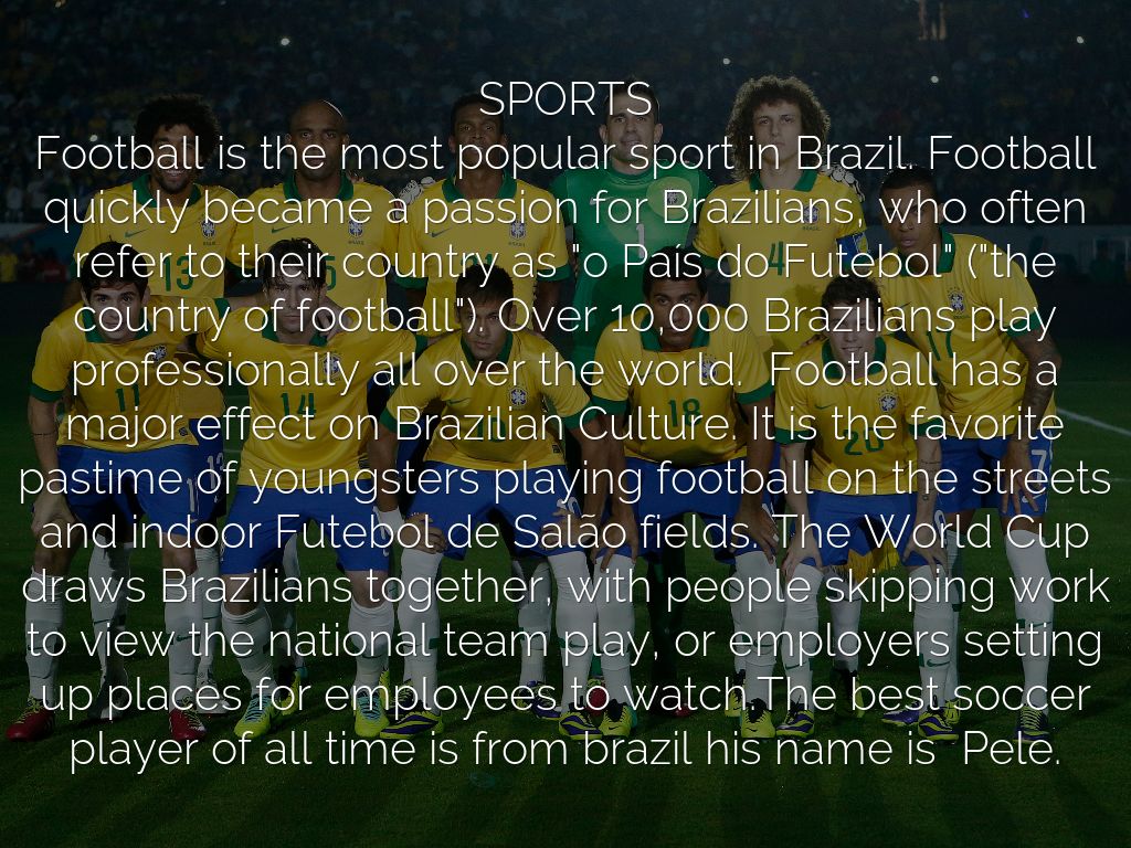 Football is the most popular sport in Brazil. Football quickly became a passion for Brazilians, who often refer to their country as "o País do Futebol" ("the country of football"). Over 10,000 Brazilians play professionally all over the world. Football has a major effect on Brazilian Culture. It is the favorite pastime of youngsters playing football on the streets and indoor Futebol de Salão fields. The World Cup draws Brazilians together, with people skipping work to view the national team play, or employers setting up places for employees to watch.The best soccer player of all time is from brazil his name is Pele.