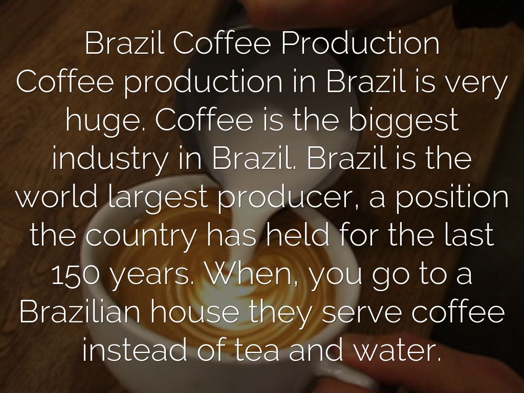 Coffee production in Brazil is very huge. Coffee is the biggest industry in Brazil. Brazil is the world largest producer, a position the country has held for the last 150 years. When, you go to a Brazilian house they serve coffee instead of tea and water.