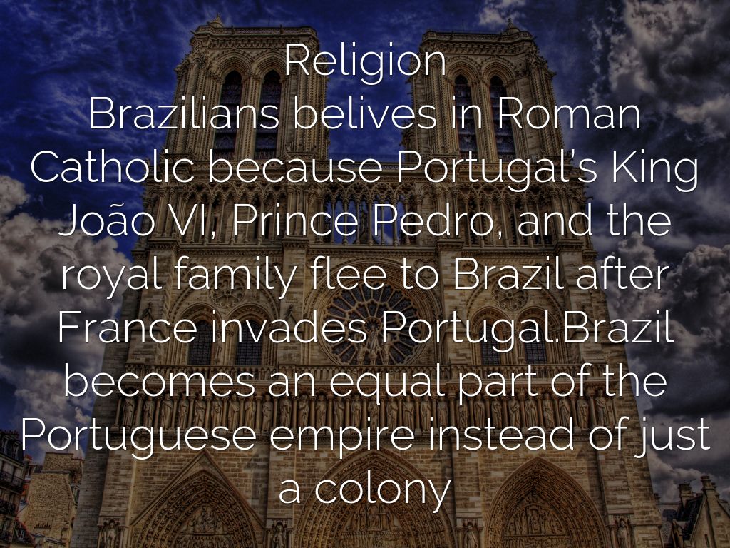 Brazilians belives in Roman Catholic because Portugal’s King João VI, Prince Pedro, and the royal family flee to Brazil after France invades Portugal.Brazil becomes an equal part of the Portuguese empire instead of just a colony