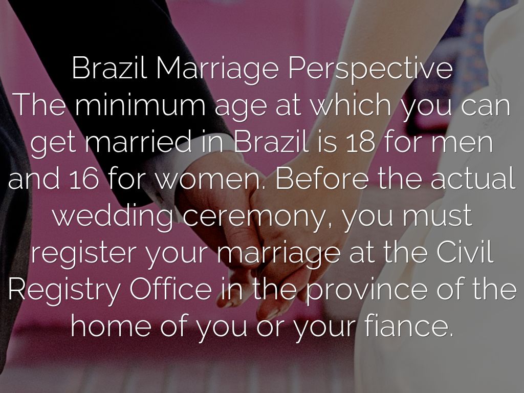 The minimum age at which you can get married in Brazil is 18 for men and 16 for women. Before the actual wedding ceremony, you must register your marriage at the Civil Registry Office in the province of the home of you or your fiance.
