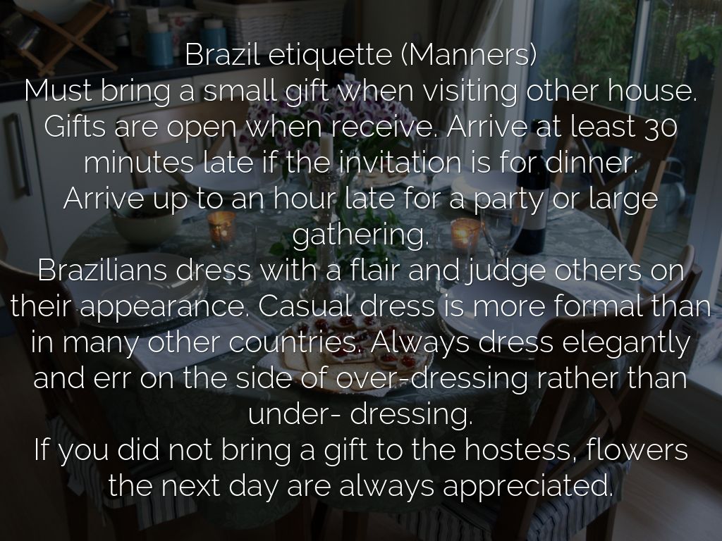 Brazilians dress with a flair and judge others on their appearance. Casual dress is more formal than in many other countries. Always dress elegantly and err on the side of over-dressing rather than under- dressing.