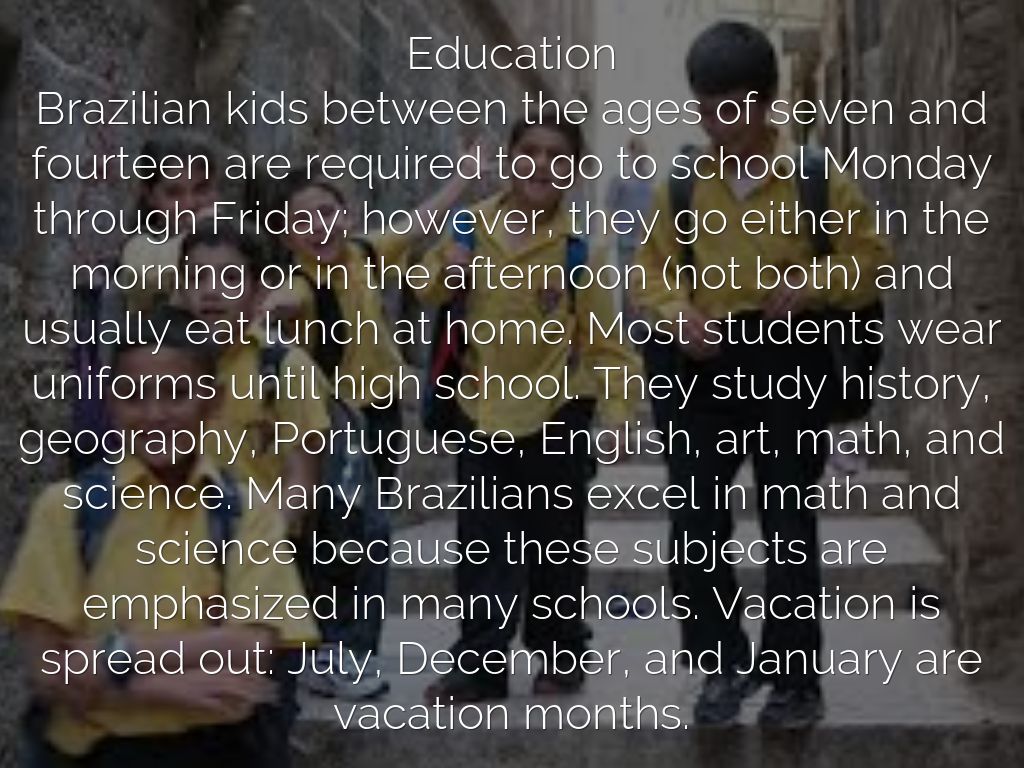 Brazilian kids between the ages of seven and fourteen are required to go to school Monday through Friday; however, they go either in the morning or in the afternoon (not both) and usually eat lunch at home. Most students wear uniforms until high school. They study history, geography, Portuguese, English, art, math, and science. Many Brazilians excel in math and science because these subjects are emphasized in many schools. Vacation is spread out: July, December, and January are vacation months.